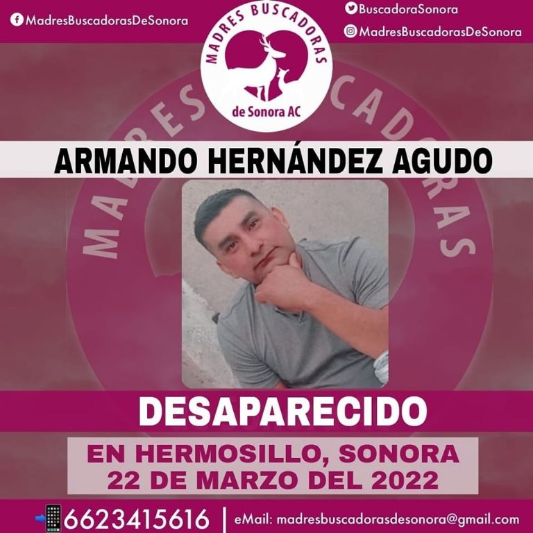Hermosillo, Sonora.- A través de redes sociales el colectivo Madres Buscadoras de Sonora informó sobre la desaparición del señor Armando Hernández Agudo, de quien nada se sabe desde hace poco más de 2 días en Hermosillo, Sonora.