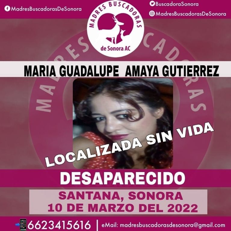 Caborca, Sonora.- El colectivo Madres Buscadoras de Sonora confirmó este fin de semana que el cuerpo sin vida de María Guadalupe Amaya Gutiérrez fue encontrado, luego de que fuera reportada como desaparecida en Caborca, Sonora.