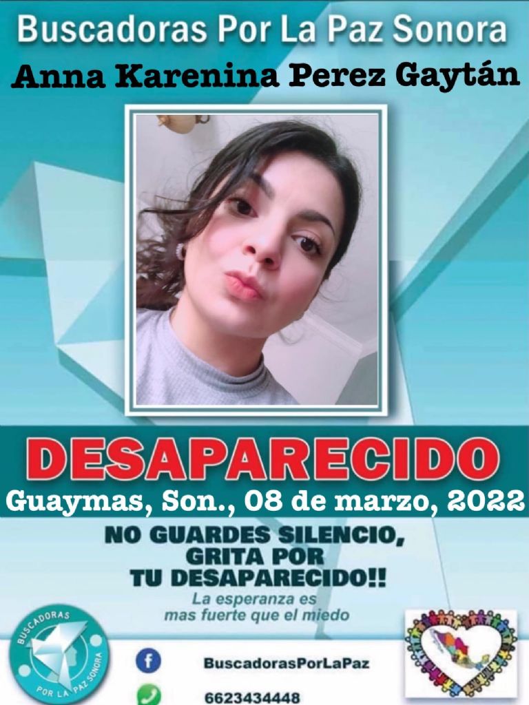 Guaymas, Sonora.- El colectivo Buscadoras por la Paz solicita la ayuda de la ciudadanía para localizar a Anna Kerenina Pérez Gaytán, quien se encuentra en calidad de desaparecida desde hace varias semanas en el Puerto de Guaymas, Sonora.