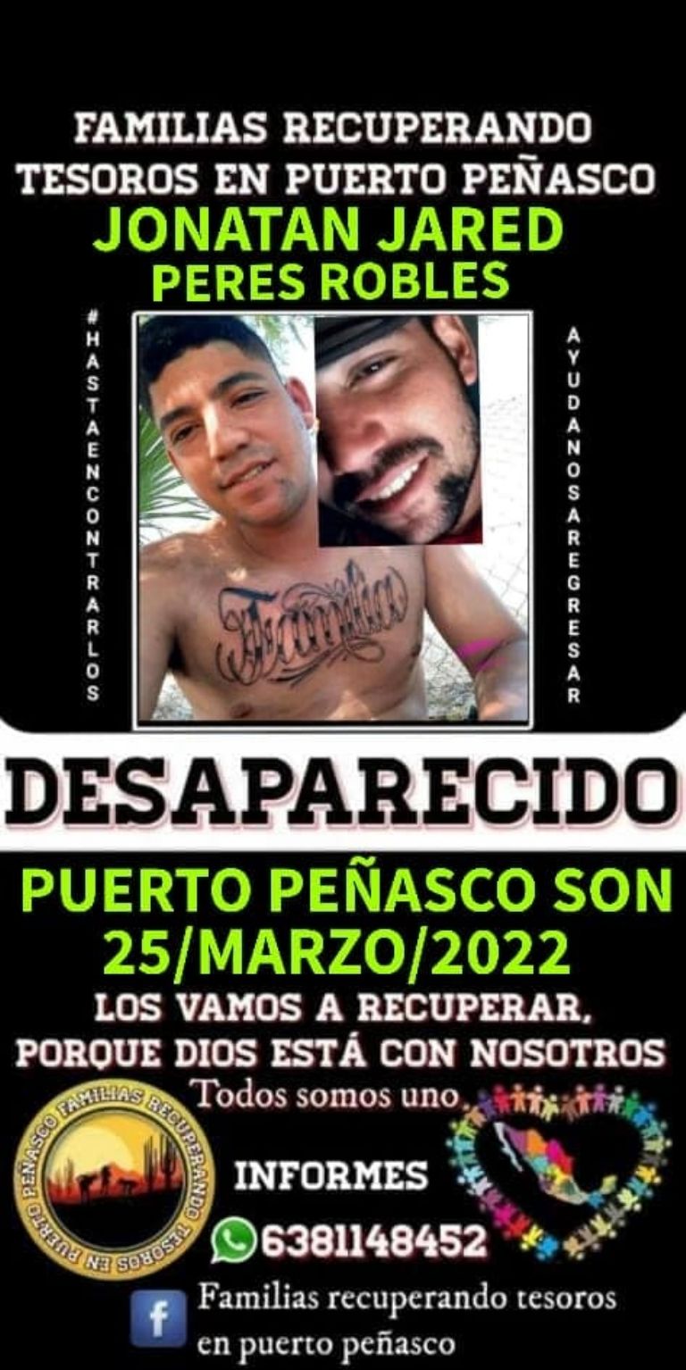Puerto Peñasco, Sonora.- El colectivo Familias Recuperado Tesoros en Puerto Peñasco pide el apoyo de la comunidad para localizar a Jhonatan Jared Pérez Robles, quien se encuentra en calidad de desaparecido desde hace varios días en Puerto Peñasco, Sonora.