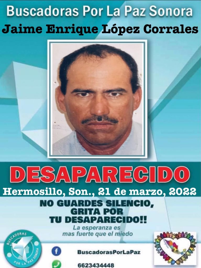 Por favor ayúdennos a difundir la ficha del señor Jaime López, su familia sufre la angustia de no tener noticias de él. Comunícate si tienes algún dato que nos guíe a su destino: 6623434448… Gracias", se lee.