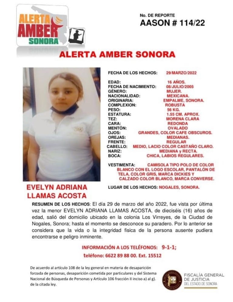 Guaymas, Sonora.- La Fiscalía General de Justicia del Estado (FGJE) de Sonora emitió una Alerta Amber para dar con el paradero de Evelyn Adriana Llamas Acosta, joven de 16 años desaparecida en Nogales.