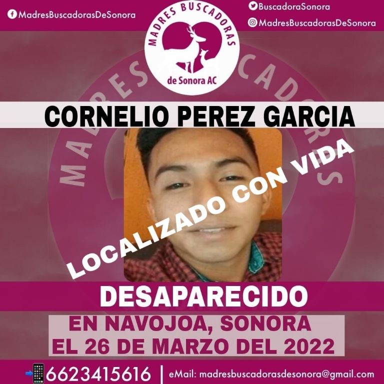Navojoa, Sonora.- Este miércoles 30 de marzo, se informó que el joven Cornelio Pérez García fue encontrado con vida, después de que su familia lo reportara como desaparecido en su natal Navojoa, Sonora.