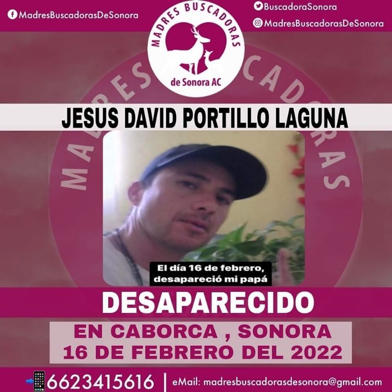 Hermosillo, Sonora.- El colectivo Madres Buscadoras de Sonora pide la colaboración de las personas para localizar a Jesús David Portillo Laguna, quien se encuentra en calidad de desaparecido desde el pasado mes de febrero en su natal Caborca, Sonora.