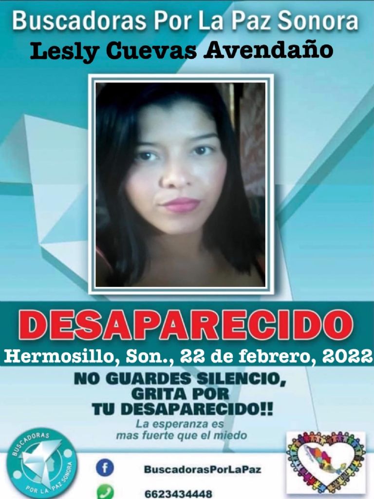 Hermosillo, Sonora.- La agrupación Buscadoras por la Paz solicita el apoyo de la ciudadanía para dar con el paradero de Lesly Cuevas Avendaño, joven que desapareció en Hermosillo, Sonora durante el pasado mes de febrero.