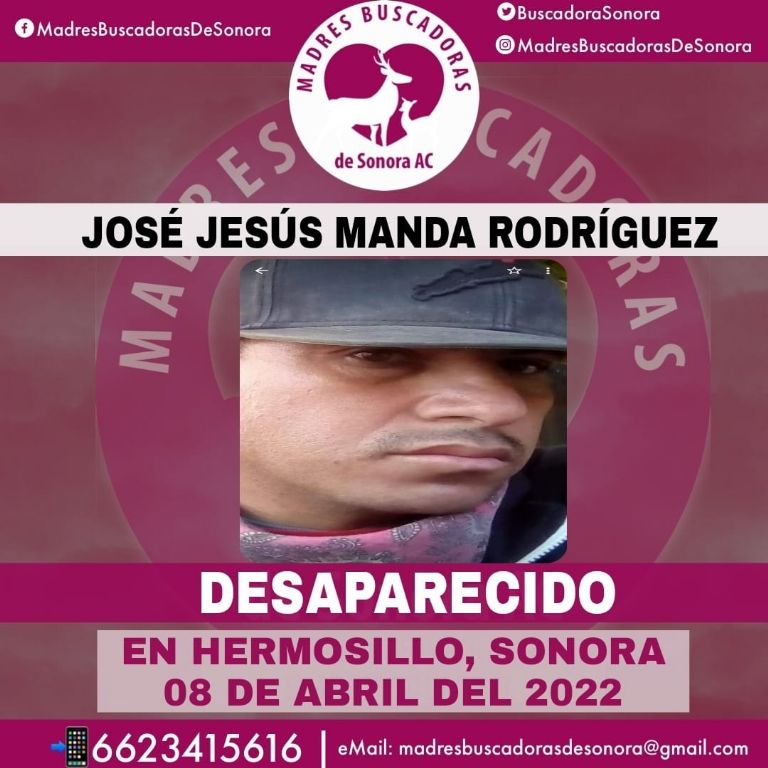 Hermosillo, Sonora.- El colectivo Madres Buscadoras de Sonora solicita el apoyo de la ciudadanía para encontrar a José Jesús Manda Rodríguez, quien se encuentra en calidad de desaparecido desde hace varios días en Hermosillo, Sonora.