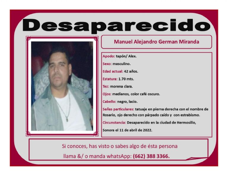 Hermosillo, Sonora.- Momentos de angustia e incertidumbre vive una familia al no saber nada sobre el paradero de Manuel Alejandro Germán Miranda, quien se encuentra desaparecido desde hace varios días en Hermosillo, Sonora.