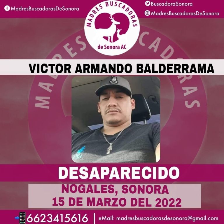 Nogales, Sonora.- El colectivo Madres Buscadoras de Sonora reportó el lamentable extravío de Víctor Armando Balderrama, de quien nada se sabe desde hace más de un mes en la ciudad de Nogales, Sonora.