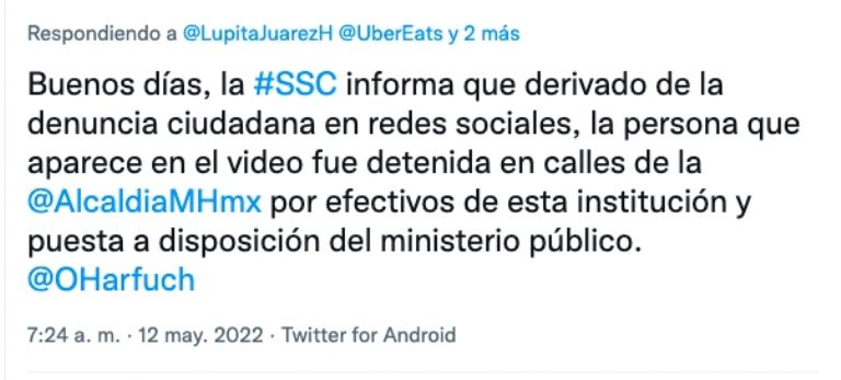 “Buenos días, la #SSC informa que derivado de la denuncia ciudadana en redes sociales, la persona que aparece en el video fue detenida en calles de la @AlcaldiaMHmx por efectivos de esta institución y puesta a disposición del ministerio público @OHarfuch".