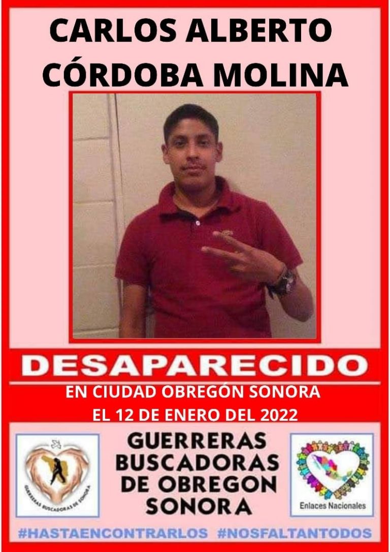 Ciudad Obregón, Sonora.- Desde hace varios meses que nada se sabe sobre el paradero Carlos Alberto Córdoba Molina, quien desapareció en el municipio de Cajeme, Sonora, y su familia solicita el apoyo de la sociedad para dar con su paradero.