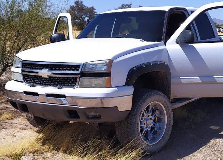Al llegar al lugar, entre Pitiquito y Altar, aseguraron tres autos; en la camioneta Chevrolet Silverado, color blanco, encontraron 26 cartuchos para arma larga, mientras que en otra camioneta Nissan Titan, color blanco, con reporte de robo desde el 12 de enero de este año, había un chaleco y bolsa táctica.