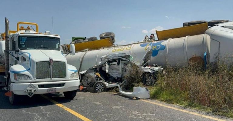 Tizayuca, Hidalgo.- Por medio de redes sociales, se difundió una video del momento exacto en el que una pipa con cloro volcó al transitar por la carretera y terminó por aplastar un vehículo tipo sedán de color blanco, que transitaba por la vía en ese momento, provocando que en la zona se desatara el caos, producto de una gran congestión vehicular tras lo ocurrido.