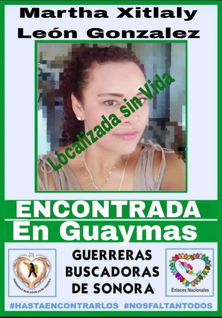 Guerreras Buscadoras de Sonora de Guaymas y Empalme, nos unimos a la pena que embarga a la familia León González, localizada sin vida Martha Xitlaly León González no como quisiéramos, pero ya tendrá un sepulcro digno", se lee en la página del colectivo.