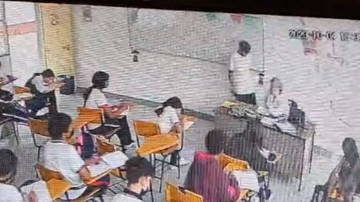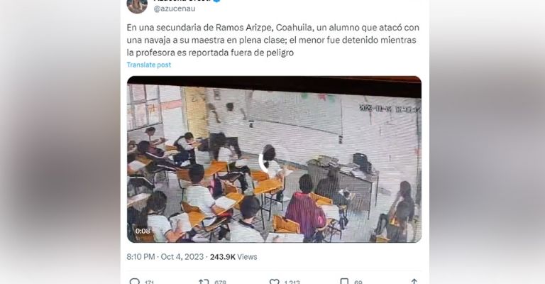 Ramos Arizpe, Coahuila.- A través de redes sociales se difundió un video en el que se muestra el momento en el que un alumno de secundaria apuñala a su maestra en repetidas ocasiones, esto luego de que se realizaba una clase, por lo que todo ocurrió en presencia de algunos alumnos, mismos que quedaron sorprendido al ver como la profesora quedó tendida en la puesta del aula tras ser atacada por la espalda.