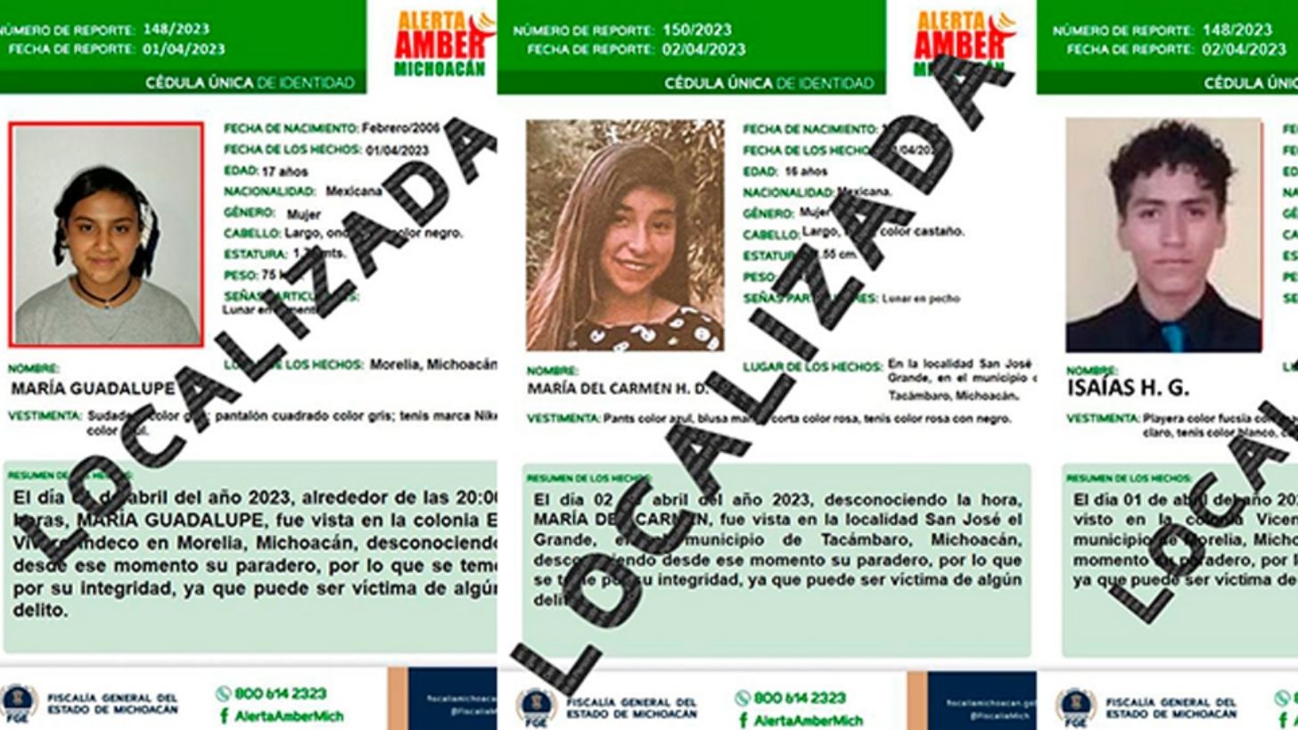 Con relación a los tres casos, se activó el mecanismo de búsqueda y localización establecido en la Alerta Amber Michoacán, por lo que personal especializado emprendió tareas de investigación respectivas, lográndose establecer el paradero de las extraviados quienes fueron asegurados a salvo.