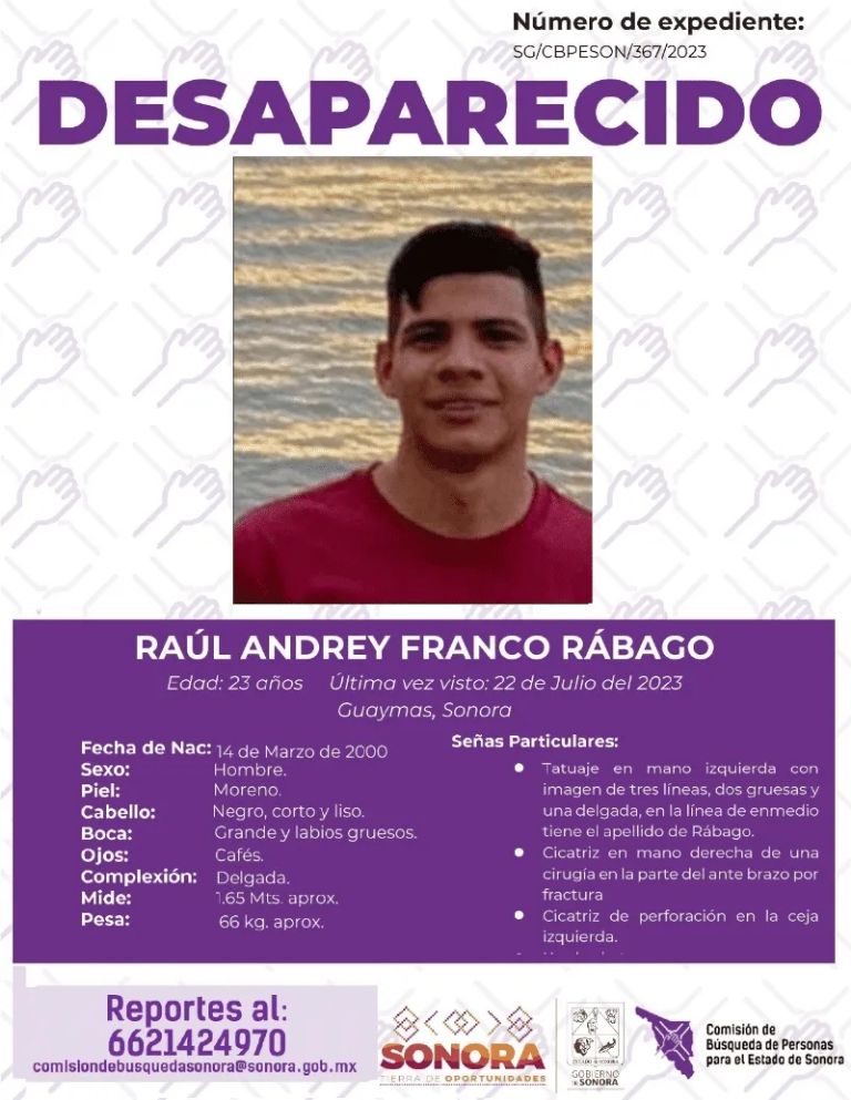 Se trata de Raúl Andrey Franco Rábago, quien de acuerdo a su ficha de búsqueda fue visto por última vez el pasado 22 de julio del 2023 en Guaymas, Sonora, aunque se desconocen detalles de los lugares que visitó antes de su desaparición, es por ello que se teme por su integridad o bien que haya sido víctima de un delito, razón por la que ahora la buscan a marchas forzadas y esperan nuevas actualizaciones de las autoridades correspondientes.