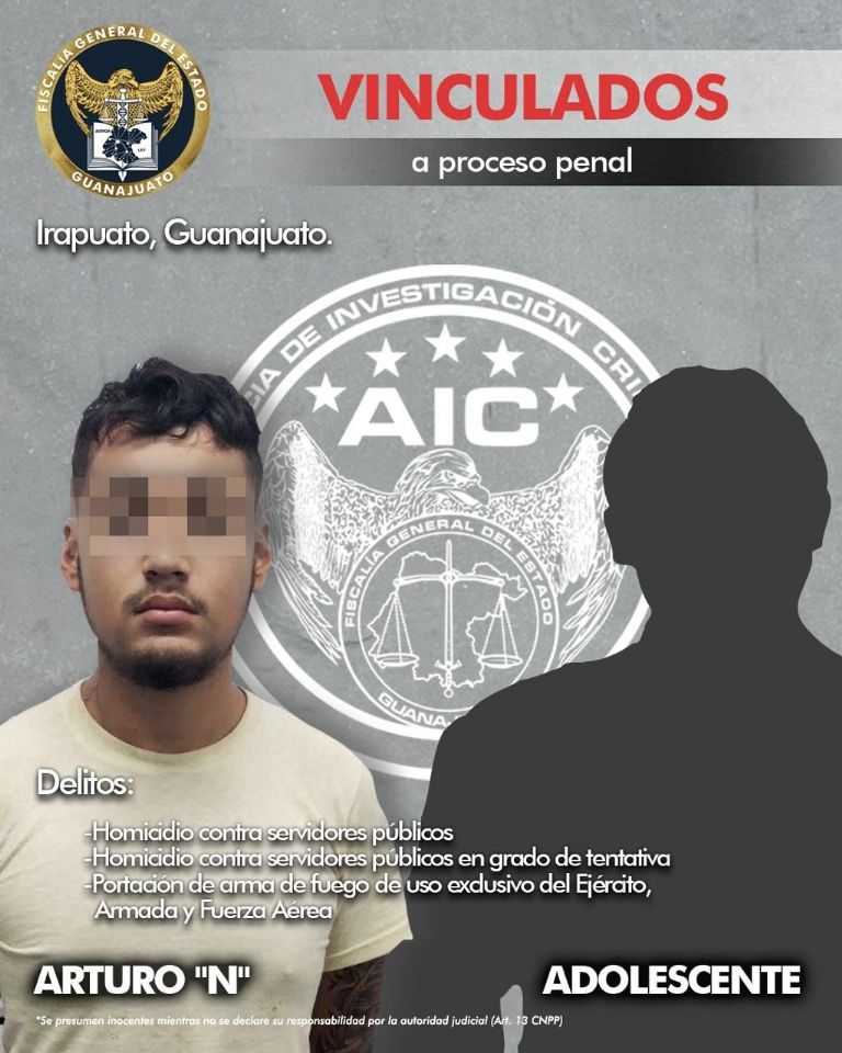 Irapuato, Guanajuato.- La Fiscalía General del Estado de Guanajuato comunicó este domingo que un hombre llamado Arturo 'N' fue detenido y vinculado a proceso penal por el delito de homicidio contra servidores públicos y tentativa de homicidio en contra de servidores públicos, por lo que se encuentra tras las rejas en espera de su sentencia. De acuerdo a la carpeta de investigación, el crimen ocurrió la madrugada del domingo 17 de noviembre de 2024.