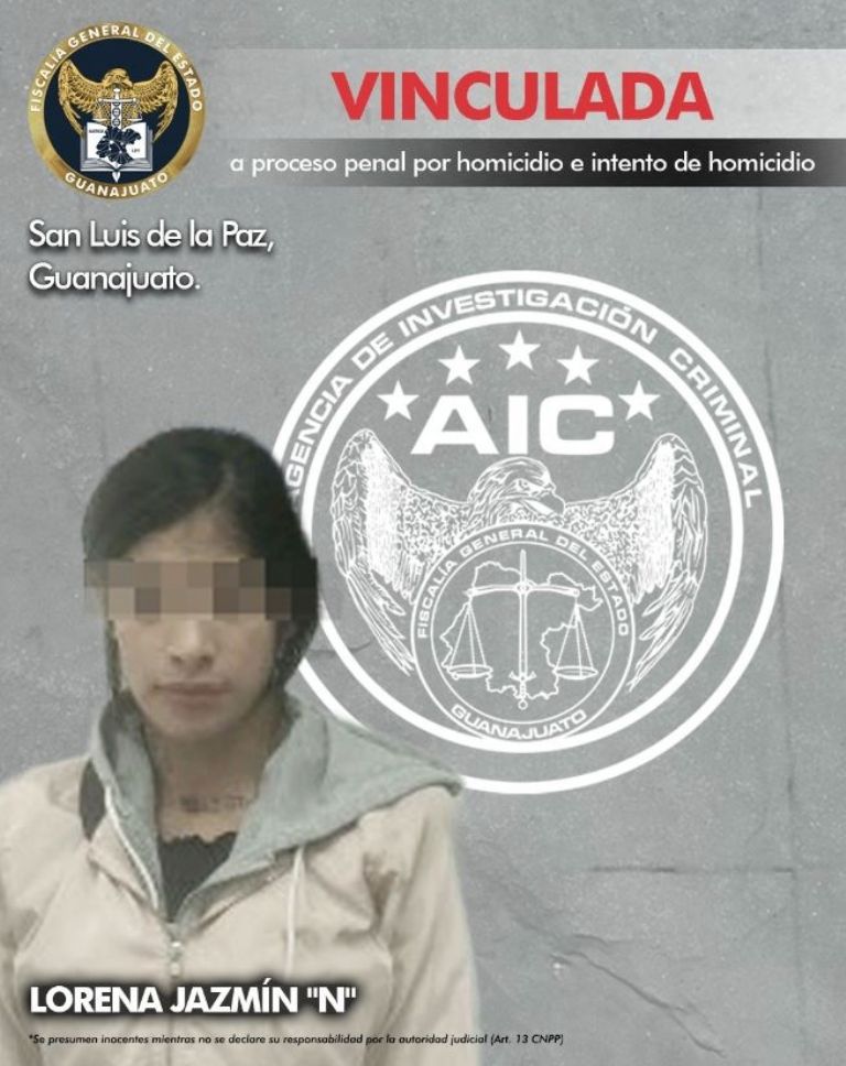 San Luis de la Paz, Guanajuato.- Una mujer identificada como Lorena Jazmín 'N' fue capturada por elementos de la Agencia de Investigación Criminal (AIC), por su probable participación en los delitos de homicidio e intento de homicidio en agravio de un hombre y una mujer, respectivamente, por lo que fue vinculada a proceso penal. De acuerdo con la Fiscalía General del Estado de Guanajuato, el crimen ocurrió el 7 de octubre de 2024.