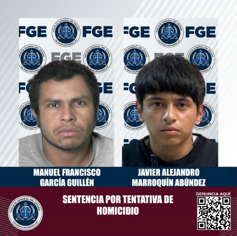 Tijuana, Baja California.- La Fiscalía General del Estado de Baja California informó que fue dictada una condena de 13 años y 4 meses de prisión en contra de dos hombres identificados como Manuel Francisco García Guillén y Javier Alejandro Marroquín Abúndez alias 'Javier Alejandro Abúndez Luna'. Estos individuos, en el mismo hecho, fueron encontrados responsables del delito homicidio calificado en grado de tentativa, cometido en la ciudad de Tijuana.