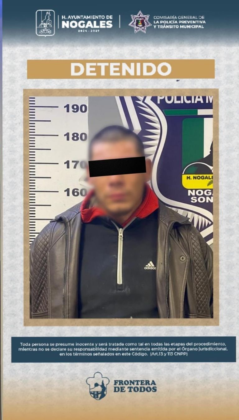 Nogales, Sonora.- Elementos de la Policía Municipal de Nogales efectuaron la detención de un sujeto identificado como Jesús G. 'N', de 28 años de edad, señalado como el presunto responsable de agredir físicamente y amenazar con un arma prohibida a un familiar directo, en un incidente ocurrido durante la noche del pasado domingo en el sector de Colinas del Yaqui. Los hechos se registraron cerca de las 23:42 horas del domingo 7 de diciembre.