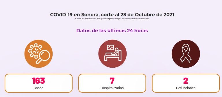 Hermosillo, Sonora.- Este sábado 23 de octubre, la Secretaría de Salud reportó 163 casos por Covid-19 y dos defunciones, luego de varios días sin que hubiera muertes por el virus. También se informó de siete personas hospitalizadas.