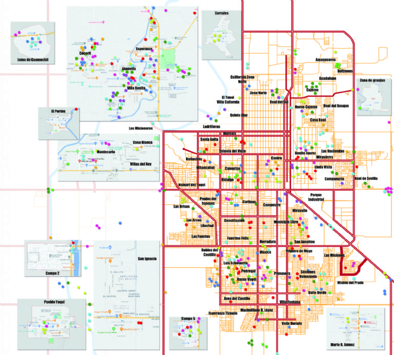 En el mapa se han colocado puntos de colores (que identifican el mes) para mostrar dónde ocurrió el suceso, es decir la dirección precisa, destacan las colonias de la periferia del sur de Ciudad Obregón y las comisarías (especialmente Esperanza y Cócorit) como los sectores más críticos del municipio, donde por lo menos una vez a la semana tiene lugar un asesinato.