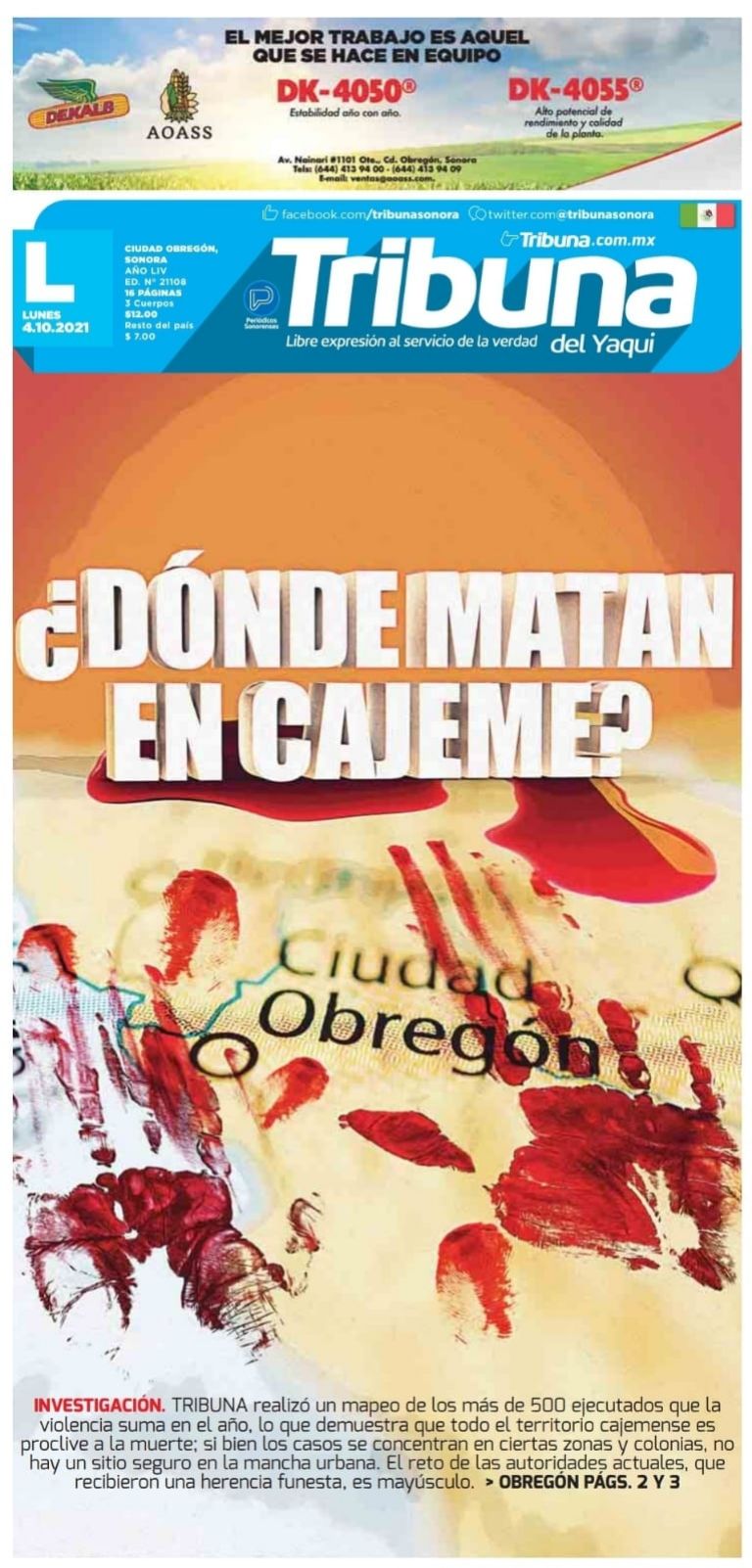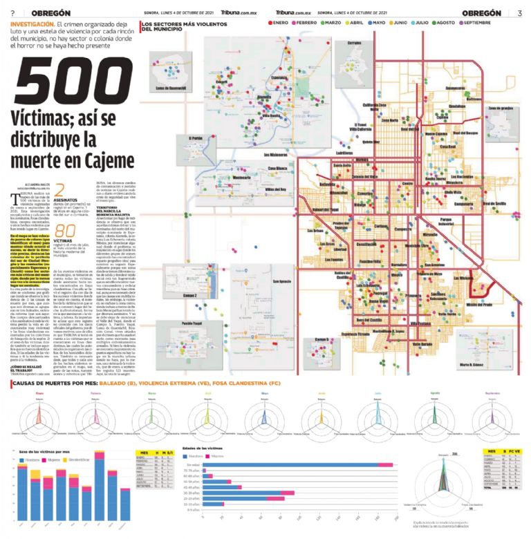 Ciudad Obregón, Sonora.- TRIBUNA realizó un mapeo de las más de 500 víctimas de la violencia registradas de enero a septiembre de 2021. Esta investigación recopila todos y cada uno de los asesinatos, fosas clandestinas, cuerpos encontrados, y otros hechos violentos que han tenido lugar en Cajeme.