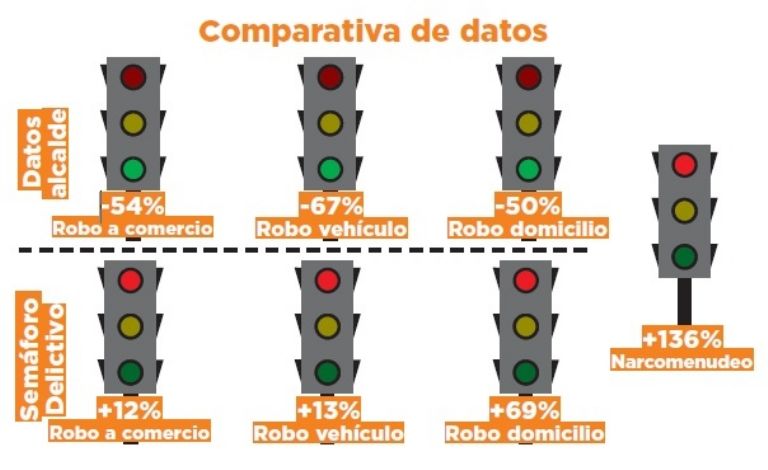 Las cifras de Mariscal se refieren especialmente a tres delitos patrimoniales: robo a vehículo con -67 por ciento; robo a comercio -54 por ciento y robo a domicilio -50 por ciento. Por el contrario, las cifras del Semáforo Delictivo (creado en base a las carpetas de investigación del Secretariado Ejecutivo del Sistema Nacional de Seguridad Pública) muestran un incremento en los mismos de la siguiente manera (al comparar los resultados 2021 contra la media en promedio): el robo a vehículo 16 por ciento de incremento en enero y 13 por ciento en febrero; robo a comercio 12 por ciento en enero y disminución del 12 por ciento en febrero y robo a domicilio con crecimiento del 94 por ciento en enero y 69 por ciento en febrero. Incluso el robo a vehículo y robo a casa aparecieron en rojo durante diciembre, enero y febrero. De marzo y abril todavía no se han publicado los resultados.