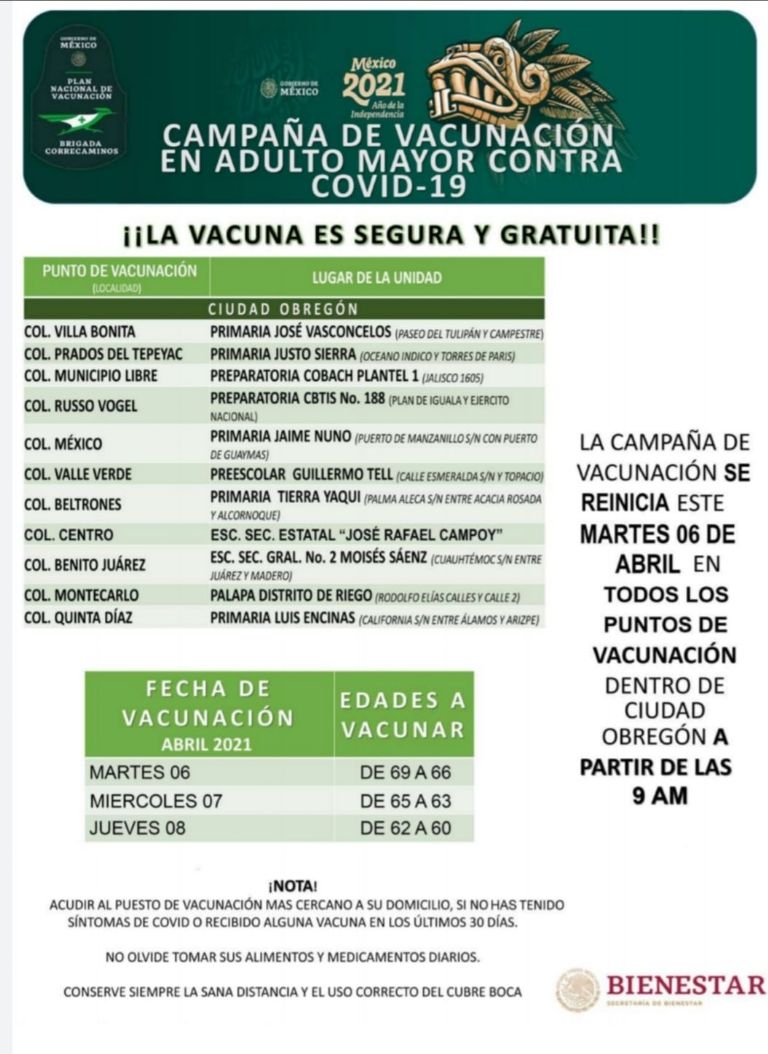 Ciudad Obregón, Sonora.- Tras suspender el proceso de vacunación de adultos mayores en Cajeme contra el Covid-19, el delegado del Bienestar, Bernabé Arana, informó que el próximo martes 6 de abril se reanudará dicha actividad aunque solamente en el casco urbano, pues las comisarías del casco rural deberán esperar.