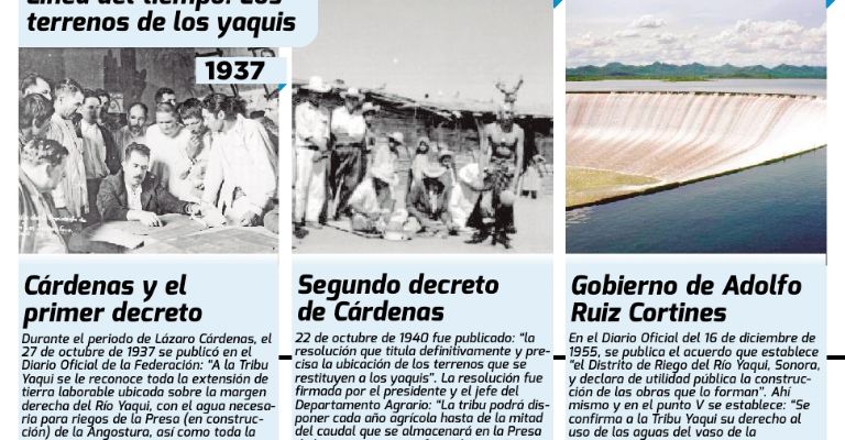 Como presidente Lázaro Cárdenas del Río trató de resolver los problemas de agua y territorio. Se derivaron dos decretos donde se reconoció toda la extensión de tierra que pertenecía a los yaquis, la cual se llamó polígono propiedad. "[...] A la Tribu Yaqui se le reconoce toda la extensión de tierra laborable ubicada sobre la margen derecha del Río Yaqui, con agua necesaria para riegos de la Presa (en construcción) de la Angostura [...]", se publicó en el Diario Oficial de la Federación.