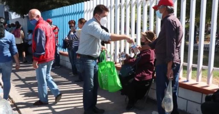 Ciudad Obregón, Sonora.- Luego de que se suspendiera el proceso por falta de dosis, este 6 de abril se reanudó la vacunación contra el Covid-19 en adultos mayores de Cajeme, nuevamente en desorden, lo que provocó que los ciudadanos se aglomeraran e hicieran largas filas mientras esperaban su turno.