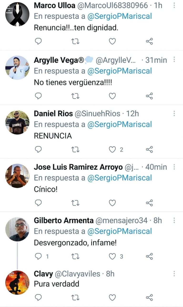 El presidente municipal de Cajeme, Sergio Pablo Mariscal Alvarado, publicó un mensaje en su cuenta de Twitter en el que reprobaba los hechos y mencionaba que sumaría todos sus esfuerzos para esclarecer el asesinato del candidato de MC.