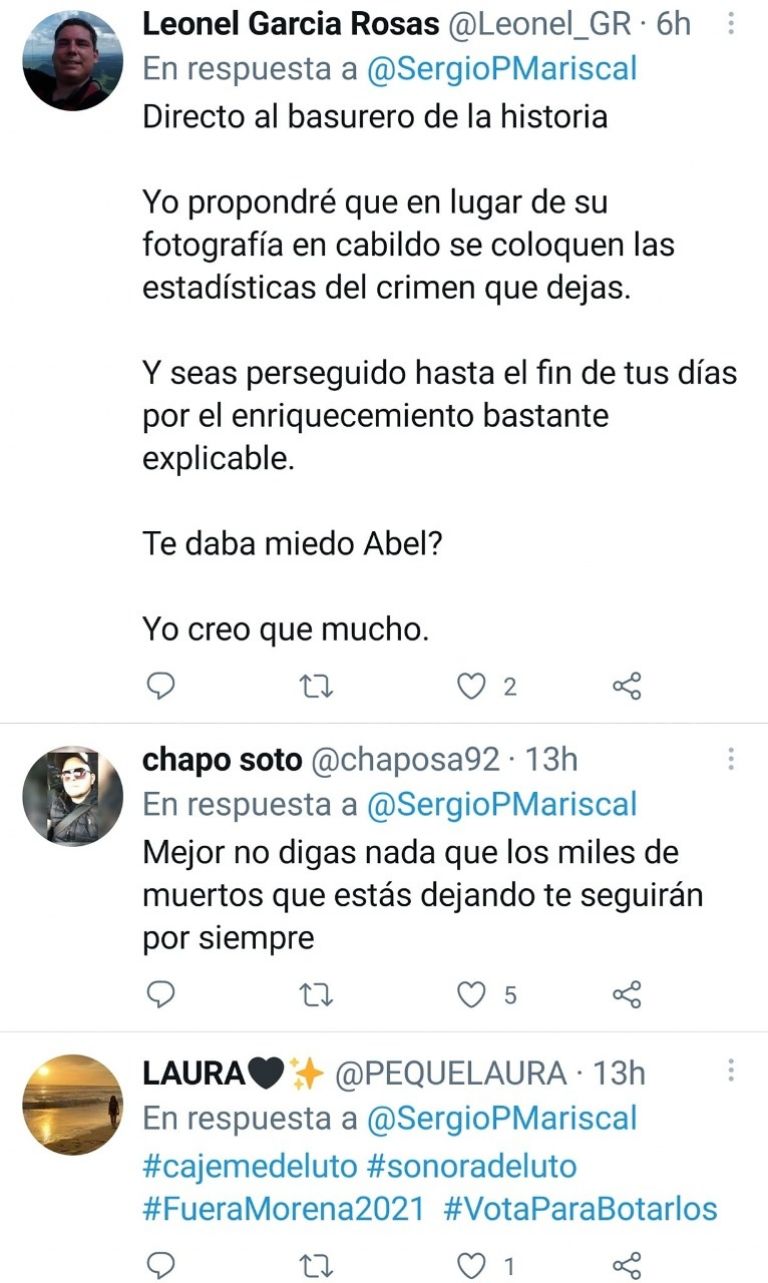 Condenamos enérgicamente el artero asesinato de Abel Murrieta, ex procurador de Sonora y expresamos nuestras más sentidas condolencias a su familia. QEPD. Nos sumamos al esfuerzo en conjunto entre órdenes de gobierno para trabajar...", publicó Mariscal Alvarado.