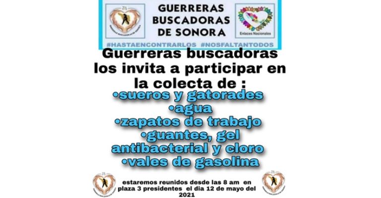 Guaymas, Sonora.- El colectivo Guerreras Buscadoras de Sonora realizó la convocatoria a una nueva colecta que tiene la finalidad de lograr el apoyo de la sociedad para obtener herramientas nuevas e insumos para continuar con la labor de localización de personas desaparecidas.