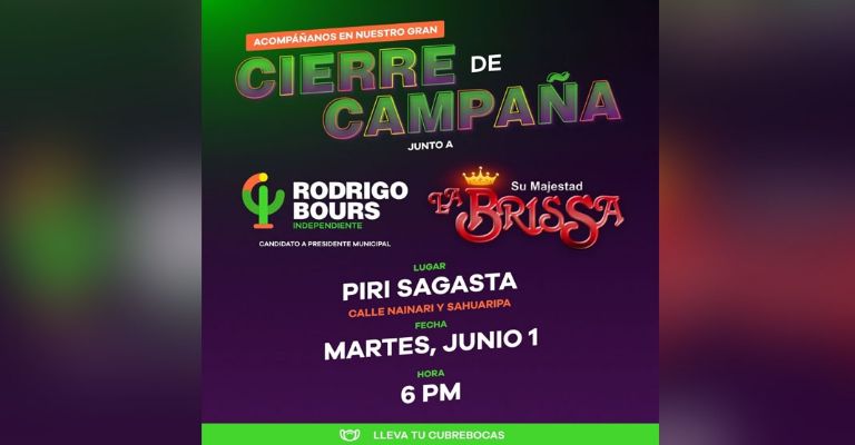 Bours Castelo invitó a la ciudadanía a su cierre y agradeció a quienes en su campaña estuvieron colaborando con él. Además a todos quienes mostraron su apoyo en su distinto recorrido por las colonias. En punto de las 19:30 horas el candidato dará su mensaje de cierre de campaña.