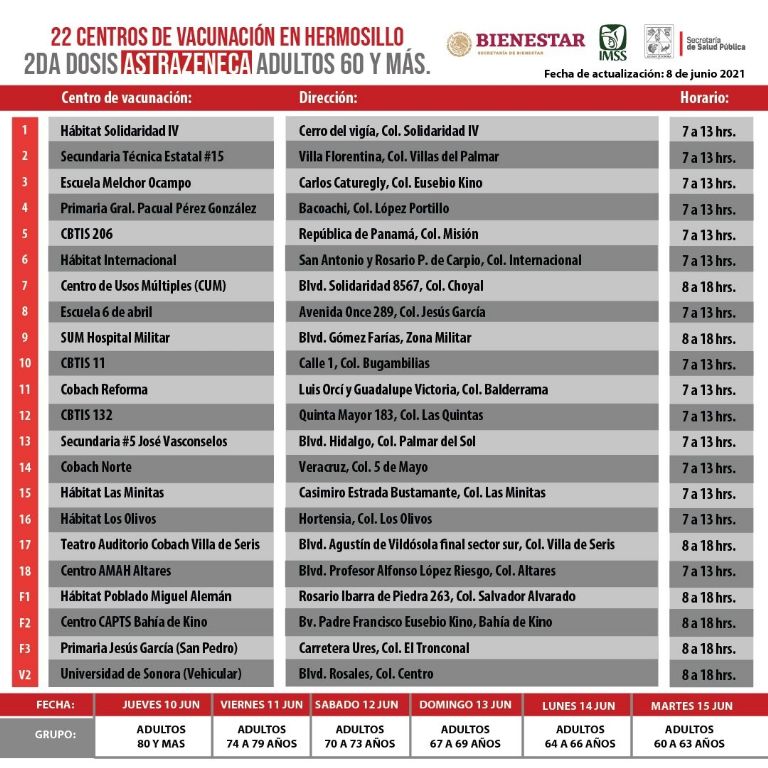 Hermosillo Tabla informativa de centros de vacunación para 2da dosis de ASTRAZENECA en adultos mayores a partir del día jueves 10 de junio.