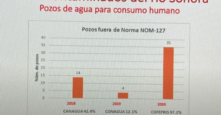 Sobre la contaminación Romo explica, que de acuerdo con los monitoreos que se han hecho, para el 2018 la Comisión Nacional del Agua (Conagua) reportó que el 42 por ciento de los pozos para consumo humano estaban fuera de la norma (NOM-127), es decir estaban contaminados por diferentes metales pesados.