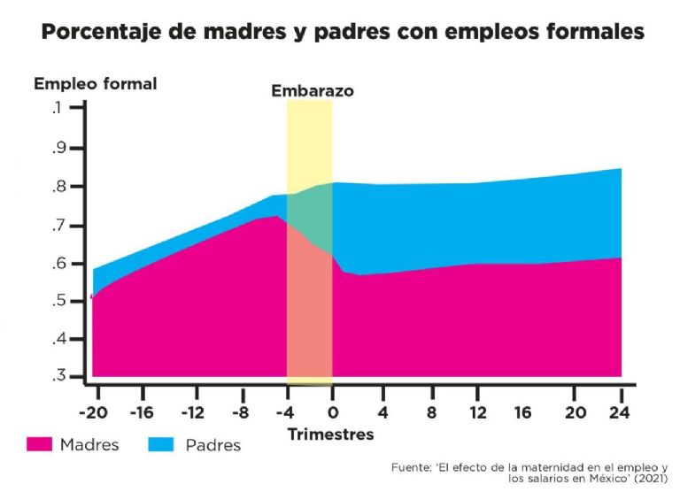 El estudio llamado ‘El efecto de la maternidad en el empleo y los salarios en México’, realizado por los investigadores mexicanos Raymundo Campos-Vazquez, Carolina Rivas-Herrera, Eduardo Alcaraz y Luis A. Martínez en base a datos del Instituto Mexicano del Seguro Social (IMSS), aborda el fenómeno que sucede cuando una mujer se embaraza y el castigo que recibirá en el mundo laboral. Los resultados demuestran que después de tener a su primer hijo pocas madres se reincorporan al mercado, incluso seis años después de tener al hijo hay menos mujeres trabajando que en comparación con el periodo previo.