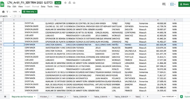 TRIBUNA revisó las nóminas de todos los trimestres disponibles, desde 2018 hasta 2021, y encontró no sólo sueldos que parecen excesivos sino también fluctuantes entre trimestres reportados. Por ejemplo, tomando el caso Guillermo Enrique Patiño Fierro, se reporta que en el primer trimestre de 2019 recibió un sueldo bruto de 141 mil 628 pesos y 40 centavos , luego, para el primer trimestre de 2020, subió a 157 mil 590 y para el primer trimestre de 2021 la cantidad bajó a 54 mil 434 pesos.