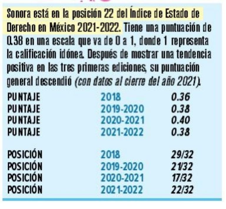 Ciudad Obregón, Sonora.- Después de mantener una tendencia positiva durante los 3 últimos años, el Estado de Derecho en Sonora tuvo una abrupta caída, debido principalmente a la crisis de inseguridad y la situación de homicidios dolosos que se vive en la entidad federativa. Así lo exponen los resultados del Índice de Estado de Derecho en México 2021 - 2022, realizado por la organización World Justice Project.