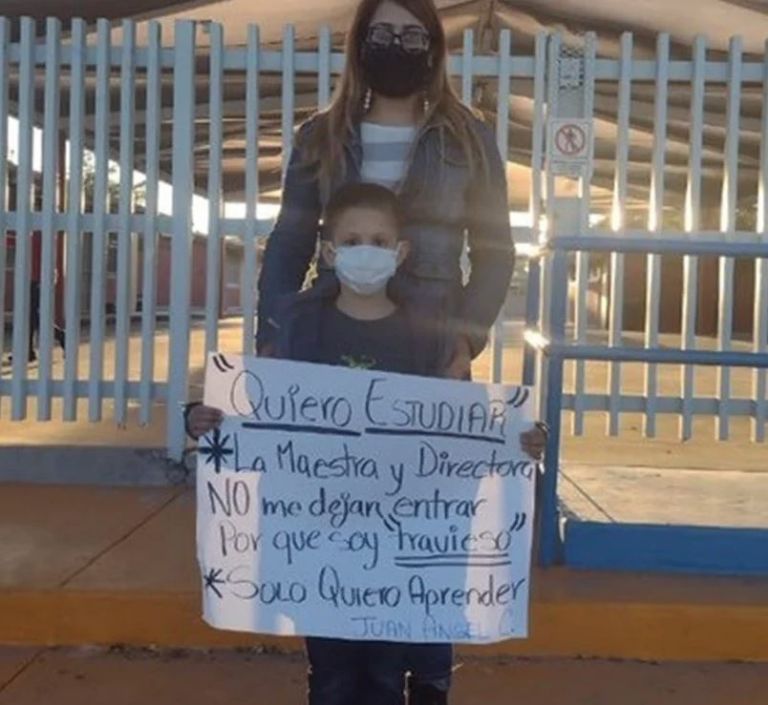 Hermosillo, Sonora.- Afuera de su escuela, el alumno de primer año, Juan Ángel C., sostiene una cartulina que dice: "Quiero estudiar, la maestra y la directora no me dejan entrar porque soy travieso, solo quiero aprender".