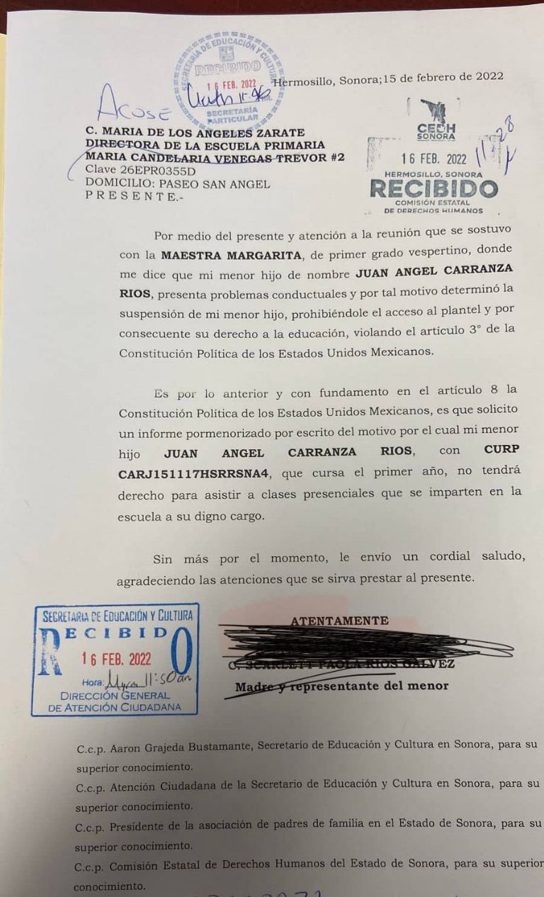 Su madre, Scarlett Paola Ríos, acudió ante la Comisión Estatal de los Derechos Humanos porque al menor se le impide entrar a la escuela llamada 'María Candelaria Vanegas Trevor' No. 2 de Hermosillo.