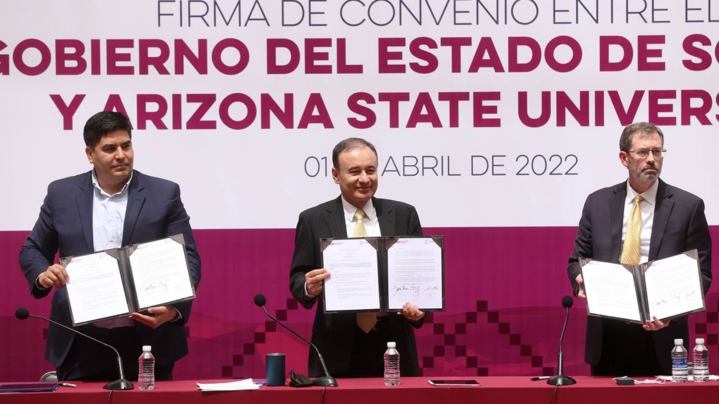 Hoy es un gran día para celebrar con ustedes y formalizar algo que el gobernador electo en aquel momento inició en el estado de Arizona. En aquella visita que recordarán que hizo, donde se reunió con la Universidad Estatal de Arizona y en aquel momento se acordó que empecemos a trabajar un modelo, donde la Universidad Estatal se vincule con el sector educativo de Sonora, pero también se vincule en las dimensiones tecnológicas, financieras y sociales que estaba impulsando y ahora ejecuta el gobernador del estado”, comentó.
