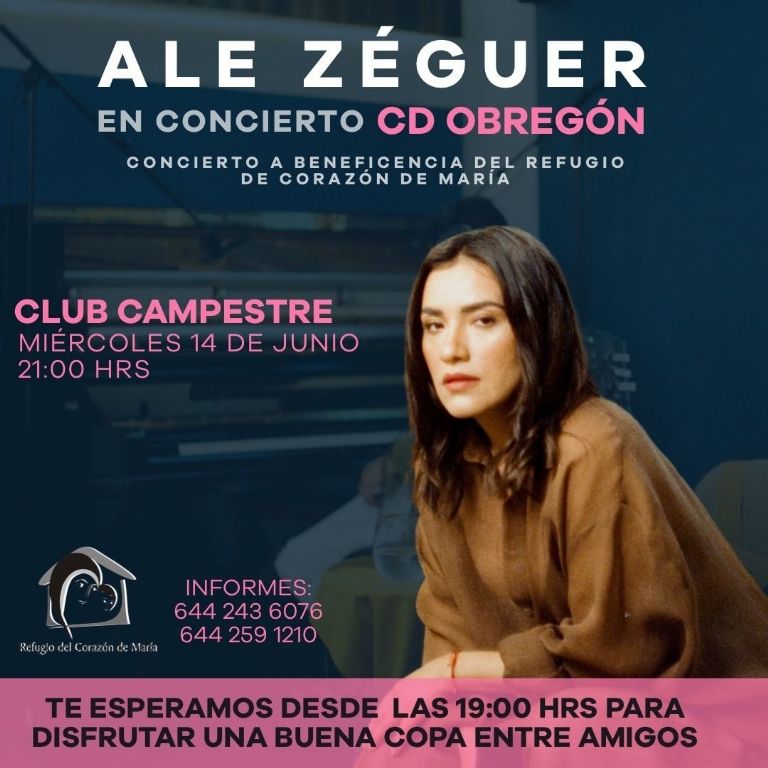Ciudad Obregón, Sonora.- La cantautora originaria de San Luis Río Colorado, Ale Zéguer, cantará por primera vez en Ciudad Obregón y lo mejor es que será por una buena causa: apoyar al Refugio del Corazón de María, una organización con 25 años de labor enfocada en apoyar a niños en situación de calle y pobreza.