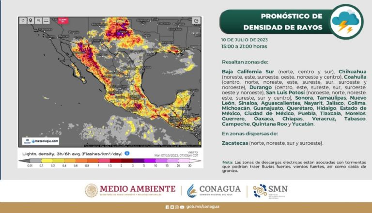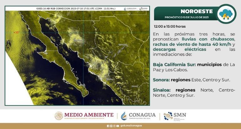 De acuerdo a la Conagua en las próximas horas habrá lluvias con chubascos, rachas de viento de hasta de 40 kilómetros por hora y descargas eléctricas al Noroeste del país, incluyendo regiones de Sonora, donde no se descarta la caída de granizo en algunas zonas, lo cual podría incrementar los niveles de ríos y arroyos, así como ocasionar deslaves e inundaciones.