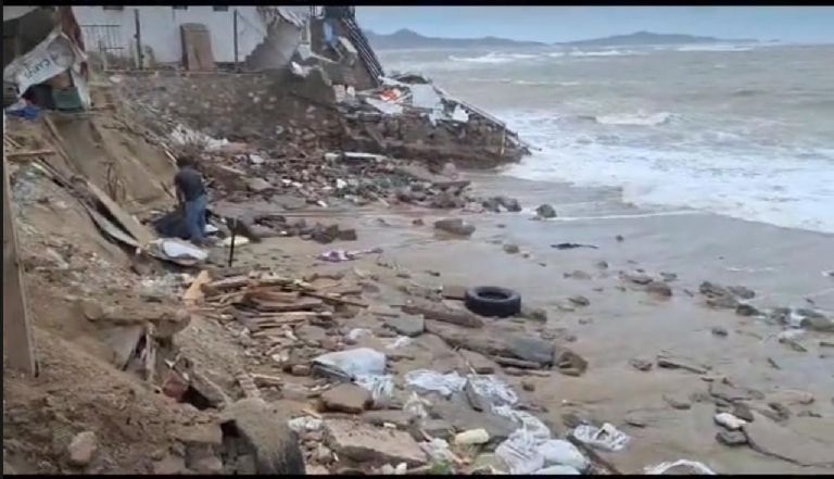 El dueño del lugar, Elizalde Muñoz, compartió que fue después de las 23:00 horas del sábado pasado cuando el fuerte oleaje derribó parte de su negocio que se ubica en la avenida Miramar, entre las calles Zihuatanejo y Rosarito, en la colonia La Cruz de la comunidad de Kino Viejo, donde también colapsó un enorme árbol de casi tres metros junto al muelle.