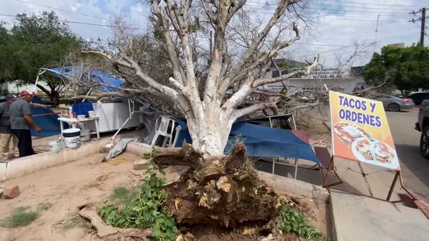 Huatabampo, Sonora.- Las fuertes ráfagas de viento registradas durante la mañana de este miércoles, provocaron el desprendimiento de un viejo árbol en la entrada norte de Huatabampo, el cual, lamentablemente cayó sobre un puesto de comida, lesionando a dos comensales.