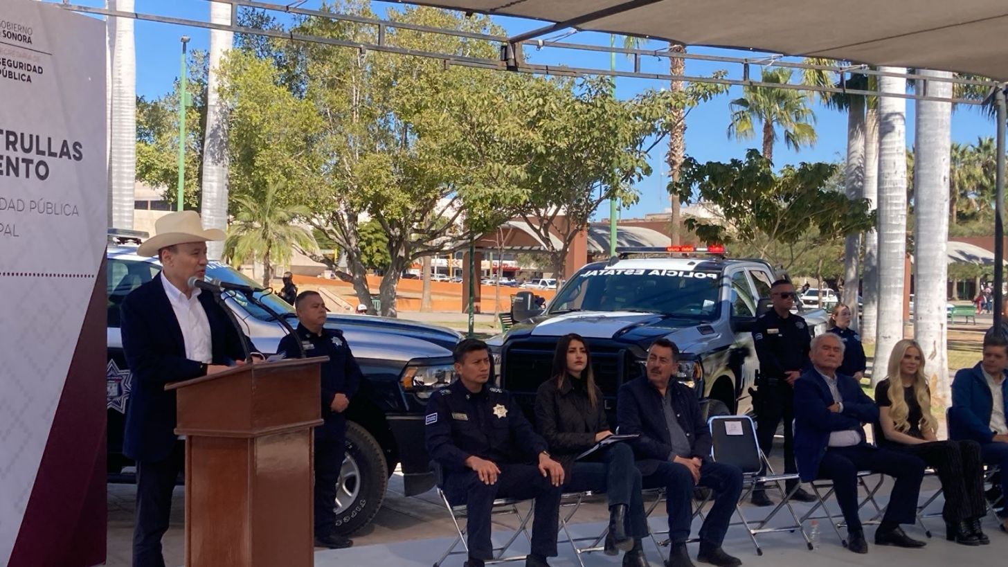 Ciudad Obregón, Sonora.- Durante una gira de trabajo del gobernador Alfonso Durazo, en Cajeme, se hizo la entrega de 19 patrullas, 463 chalecos y 383 fornituras a la b, con una inversión de 28 millones 835 mil 600 pesos para el reforzamiento para el combate al delito en el sur del estado.