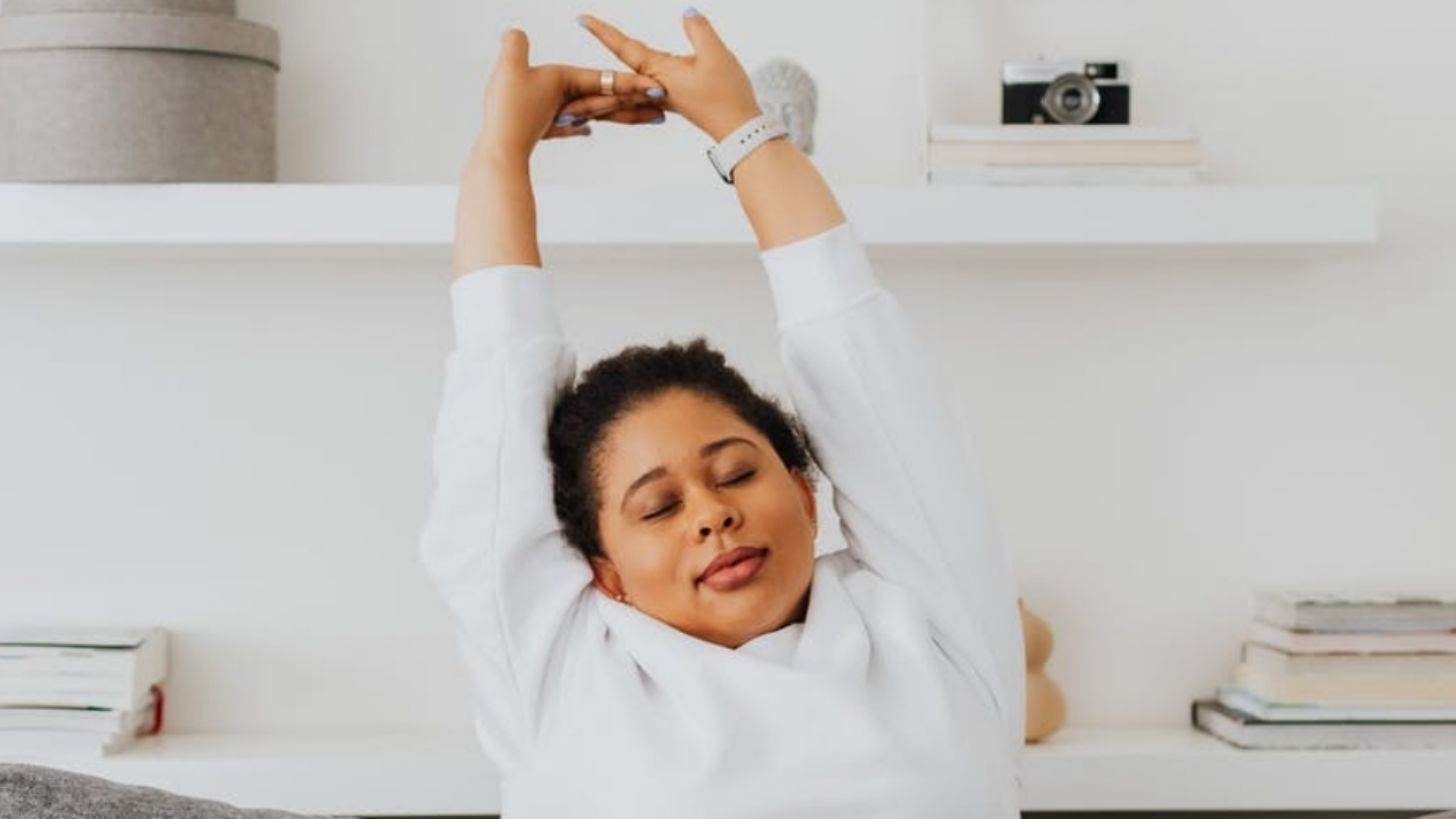 Sentada al igual que el estiramiento anterior, estira los brazos como si quisieras alcanzar el cielo y une ambas manos por las palmas y desciende poco a poco. Repite esto 4 veces.