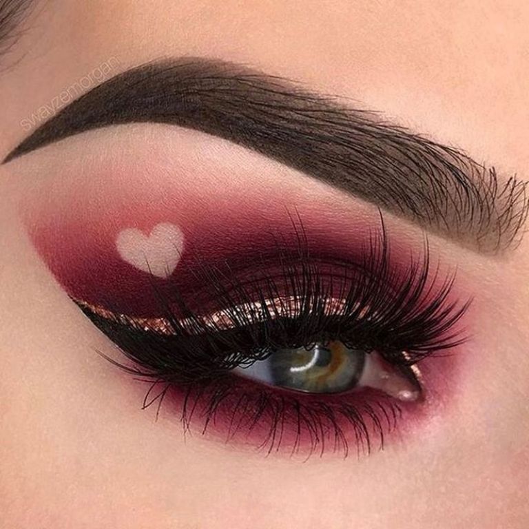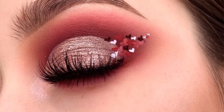 Las sombras rosas con tonos café metálico ayudarán a realzar tu mirada, además puede complementar tu make up con algunos corazones como lo ves en la imagen.
